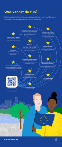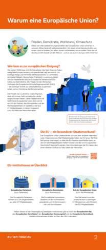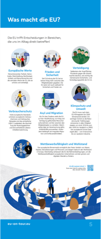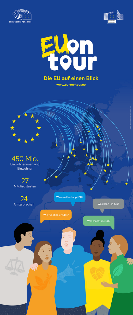 Die Wanderausstellung EU on tour - die EU auf einen Blick erklärt die Grundlagen, Institutionen, aktuelle Themen und Beteiligungsmöglichkeiten der Europäischen Union. Die Ausstellung umfasst sechs Roll-Ups (je 85x200cm) mit Informationen zur Europäischen Union und ist für den Einsatz in geschlossenen Räumen gedacht. Sollten Sie die Ausstellung im Freien aufstellen wollen, ist auf Anfrage eine Outdoor-Version erhältlich.